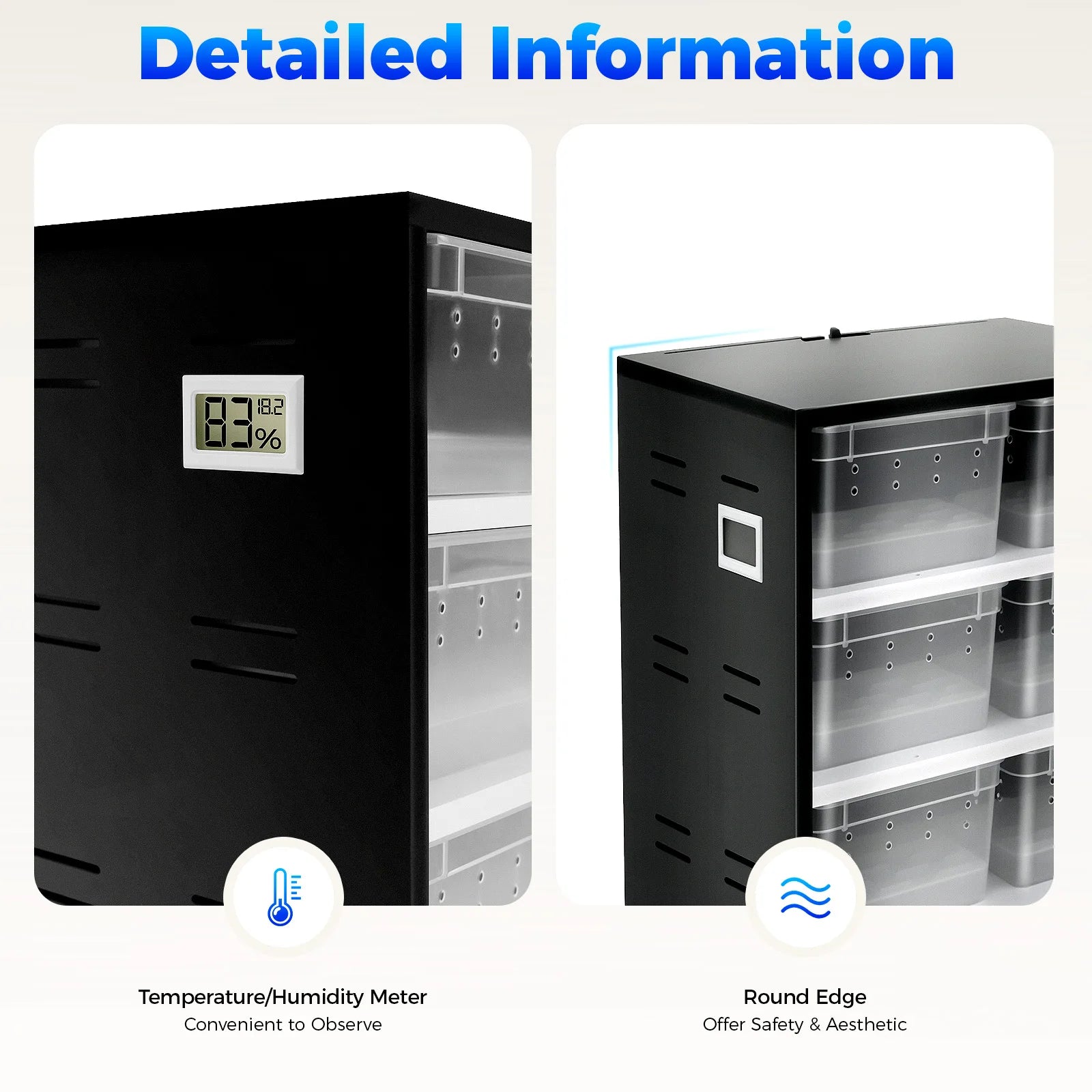 With its compact design and powerful features, this breeding cabinet is ideal for keeping your amphibian pets. It is designed with multiple clear boxes for easy observation and management of your pets. Each box is well-ventilated to ensure a healthy living environment for your pet. The cabinet is made of premium material with a stylish appearance and is suitable for various home environments. Equipped with a heating pad, it can provide your pet with ideal living conditions, making your pet's life more comfortable and safe.